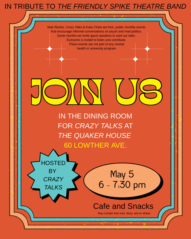 The Friendly Spike Theatre Band is a registered charity that has been producing theatrical play productions, literary works, and various art projects by and about the marginalized since 1989. Founded by Ruth Stackhouse and others, this theatre company is a community whose participants are artists, playwrights, and theatre actors who identify as disabled, psychiatric and or attempt survivors, mental health advocates, social activists, MAD, deaf, and mobility impaired.