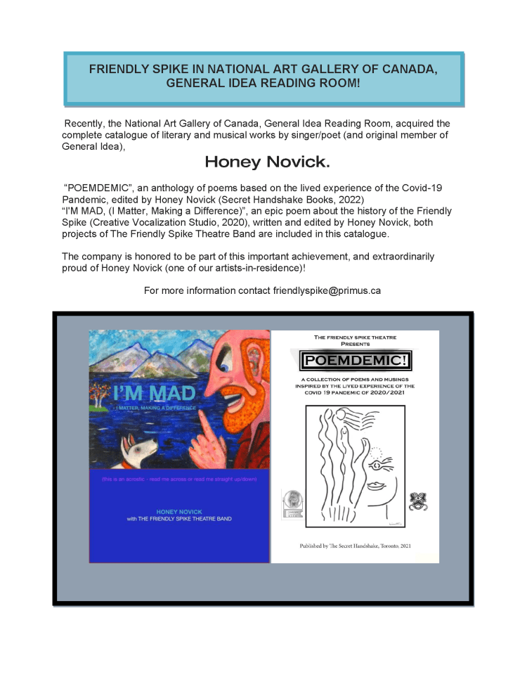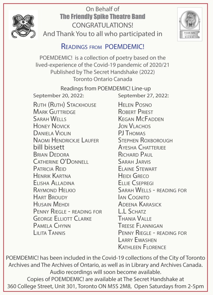 After many months in production, in late January of this year, POEMDEMIC! , our anthology of poems based on the lived-experience of the Covid-19 Pandemic 2020/21, was ready for print. Published by Secret Handshake Books, the collection is now available at The Secret Handshake Gallery, 360 College Street, Unit 301, on Saturdays between 2 and 4pm. It is a strong historical document as well as an artistic one, and has been acquired for inclusion in Library and Archives Canada, as well as the Covid-19 collections of City of Toronto Archives and the Archives of Ontario.