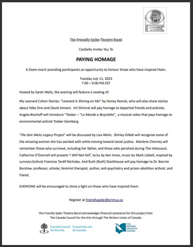 STEP RIGHT UP! Ruth (Ruth) Stackhouse will be making a zoom presentation about the history of The Friendly Spike Theatre Band, and it’s involvement in Mad Pride, at the Step Right Up Disability Theatre Symposium on the afternoon of June 21st, if you would like a link to her presentation please email [email protected] .