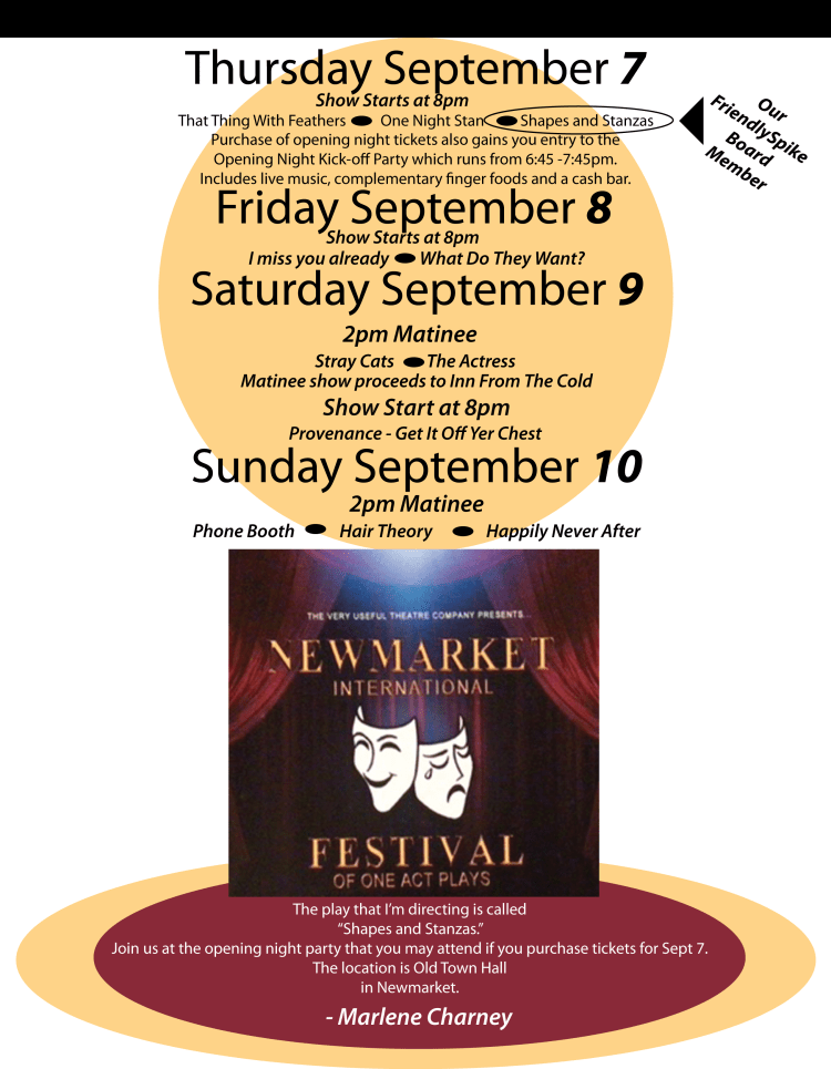 Our FSTB Board Member, Marlene, directed a one act play in the Newmarket Intnl Festival.
