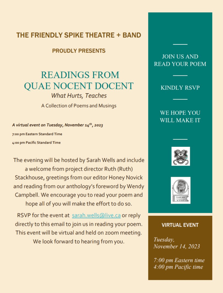 Virtual Reading was from Quae Nocent Docent on Zoom November 14th, 2023 7pm EST, 4pm PST. For information contact [email protected] .